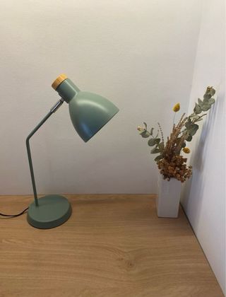 Preciosa lámpara de escritorio de Maison du Monde. Es de color verde y tiene un diseño nórdico muy elegante. - Ideal para iluminar tu espacio de trabajo o estudio. - Combina metal y madera, creando un estilo único. - Se encuentra en perfecto estado.