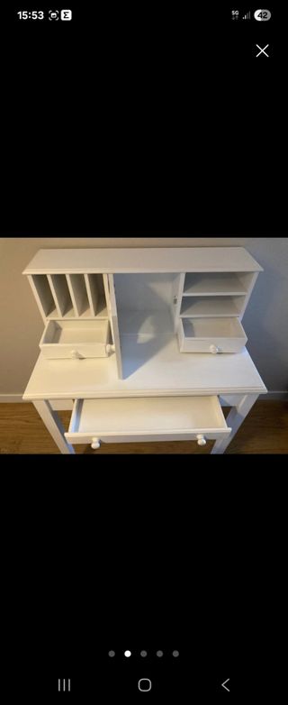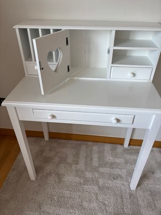 Escritorio infantil de madera en color blanco, con un diseño encantador. - Compartimentos para organización. - Puerta con detalle de corazón y rejilla. - Cajones superiores para almacenamiento. - Cajón principal amplio. -Tiene algunos desperfectos del uso, como un par de pegatinas que habría que quitar y unas manchas que se pueden arreglar fácilmente con un poco de pintura. Por lo demás está perfecto para seguir utilizándose sin problema.