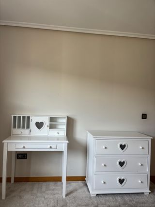 Conjunto de muebles infantiles en color blanco, ideal para una habitación infantil. - Escritorio con cajones y compartimentos. largo 85/ ancho 48/alto 80 hasta escritorio y 110 con estante - Cómoda con tres cajones. largo 90/ancho 45 /alto 85 - Diseño con detalles de corazón. madera maciza. MAISON DU MONDE