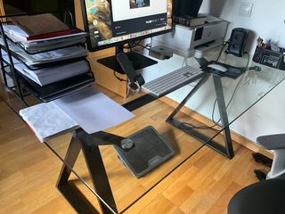 Elegante mesa de escritorio con un diseño moderno y funcional. - Superficie de cristal transparente. - Estructura robusta de metal negro.