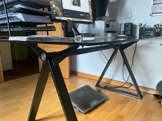 Elegante escritorio con superficie de cristal y estructura metálica. - Diseño moderno y minimalista. - Patas metálicas en forma de U invertida. - Amplia superficie de trabajo.