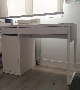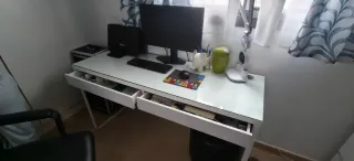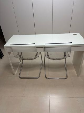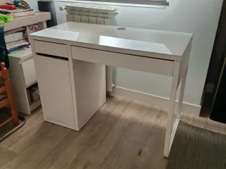 Escritorio MICKE con dos cajones, ideal para tu espacio de trabajo o estudio. Su diseño moderno y funcional se adapta a cualquier habitación. - Acabado en blanco. - Dos cajones amplios para almacenamiento. - Hueco para pasar cables. Está practicamente nuevo, con signos de uso.