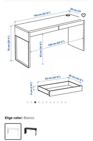 Mesa del IKEA "Mike" color negro bien conservada. Medidas mesa: 142 x 50 x 75 Medidas cajones: 65 x 38 x 8 Además tiene un hueco para poder pasar los cables y ocultarlos tras un canal en la parte posterior de la mesa. Web Ikea: "Un look de líneas sencillas que queda bien en cualquier parte. Se puede combinar con otros escritorios o módulos de cajones de la serie MICKE para tener más espacio de trabajo. El práctico diseño de la parte posterior permite ocultar los cables."
