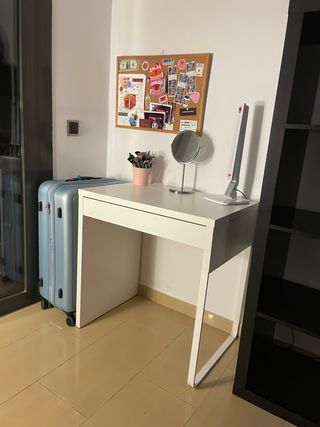 Escritorio Micke de Ikea (precio original 79,99€) Medidas: 73x90x50 Tiene algún desperfecto como se ve en la foto y le falta una balda. Solo para venir a recoger. Mi edificio tiene ascensor así que será fácil bajarlo.