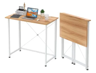 Mesa de escritorio plegable con un diseño moderno y funcional. Ideal para optimizar espacios. - Tablero con acabado en madera. - Patas plegables de metal blanco.