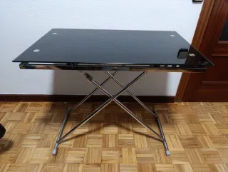 Mesa escritorio auxiliar con superficie de cristal negro y estructura metálica diferentes alturas - Diseño moderno y elegante. - Patas plegables para fácil almacenamiento. - Acabado brillante.