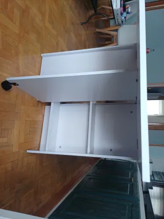 Escritorio plegable - Tablero con acabado en madera. - Patas y estructura de metal blanco Ocupa muy poco espacio Esta como nuevo Se recoge en Pinar de Chamartin