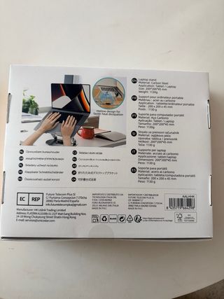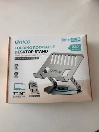 Soporte plegable y giratorio para portátil y tablet. - Fabricado en acero al carbono. - Base con silicona antideslizante. - Rotación de 360 grados. - Adecuado para dispositivos de 7 a 14 pulgadas. - Diseño plegable para facilitar su almacenamiento.