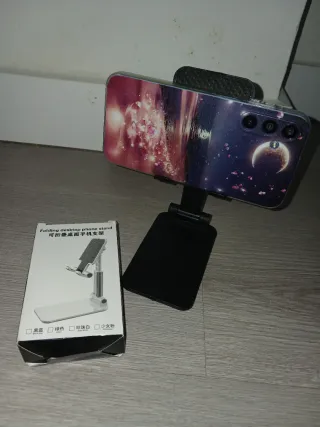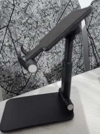 Soporte de escritorio plegable para teléfonos móviles. Su diseño permite ajustarlo a diferentes ángulos y alturas. - Base estable y antideslizante. - Materiales resistentes. - Diseño compacto y portátil.