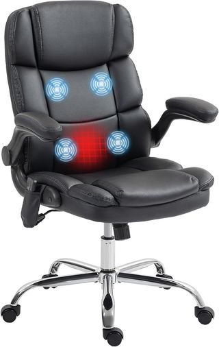 Silla de oficina masajeadora con masaje a 4 puntos y calor lumbar, control remoto y temporizador de 15/30 min. Apoyabrazos plegables a 90° para ahorrar espacio. Tapizado en cuero PU, acolchado en espuma, dimensiones 71L x 66P x 104-112A cm, asiento 51L x 48P cm, altura del asiento 48-56 cm, respaldo 51L x 61A cm. Base de acero y ruedas de PU silenciosas, carga máxima 120 kg. Función de inclinación para un suave movimiento oscilante. Incluye silla, control remoto, adaptador y manual. Montaje requerido. Color Negro.