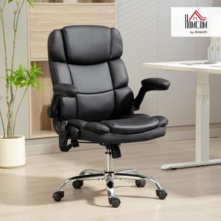 Silla De Oficina Masajeadora 4 Puntos Vibrante Con Función De Balanceo Y Calor, Silla De Oficina Escritorio En Cuero PU Con Apoyabrazos Plegables, Altura Ajustable, Negro
