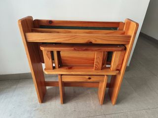 Precioso escritorio de madera maciza con un diseño único y elegante que incluye la silla. Consta de una estructura plegable y una parte superior desmontable que incluye tres cajones amplios para organizar material de oficina, documentos o accesorios. La madera tiene un tono calido y elegante, perfecto para dormitorio, despacho, estudio o rincón creativo. Incluye silla a juego. En buen estado Robusto, estable y funcional Fácil de transportar gracias a su estructura desmontable. Medidas Alto de la mesa: 73 y 93 con cajonera Ancho:60 Largo: 80. Cajonera el ancho: 24