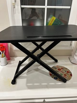 Este elevador portátil te permite ajustar la altura de tu escritorio de forma sencilla. Su diseño plegable lo hace fácil de almacenar y transportar. - Color negro. - Estructura metálica. - Superficie de trabajo lisa.