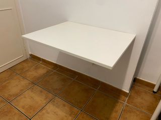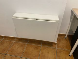Vendo mesa abatible de pared IKEA NORBERG, color blanco. Ideal para espacios pequeños, cocinas, oficinas o entradas. Se pliega contra la pared para ahorrar espacio y tiene compartimento de almacenamiento interior. - Color blanco. - Medidas: 74x60 cm.