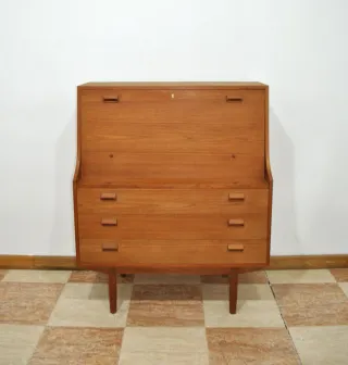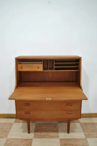 REF: PA-278 : Elegante escritorio secreter de diseño danés Mid Century, fabricado en madera de teca por la reconocida firma Søborg Møbler (Made in Denmark), como se aprecia en la etiqueta original conservada en la parte posterior. Pieza auténtica de los años 60, representativa del diseño escandinavo por sus líneas limpias, proporciones equilibradas y funcionalidad refinada. El mueble presenta una estructura elevada sobre patas cónicas, característica del modernismo nórdico. Medidas: 100 cm ancho x 46 cm fondo x 122 cm alto. Escandinavo, vintage, Art decó, modernista, Gplan, Mcintosh, minimalista, retro, sueco.