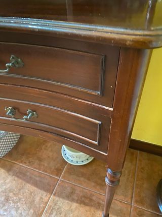 Mueble versátil que combina la funcionalidad de un escritorio secreter con la de una mesita auxiliar, presentando un elegante estilo inglés. - Acabado en madera oscura. - Cajones con tiradores ornamentales. - Patas torneadas.