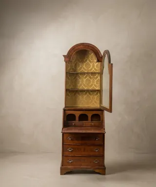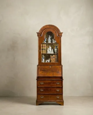 Este Bureau-Cabinet de estilo Reina Ana es el equilibrio perfecto entre una biblioteca de exposición y un despacho privado. Tipo de Mueble: Bureau-Cabinet / Secreter con Vitrina. Estilo: Reina Ana / Georgiano Temprano. Época: Mediados del Siglo XX. Material: Madera de Nogal y herrajes de latón. Interior: Vitrina forrada en damasco dorado. Distribución: Vitrina superior, escritorio abatible y 3 cajones inferiores. Ancho: 60 cm. Fondo: 43 cm. Alto: 194 cm. Envío gratuito a península.