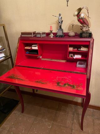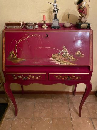 Elegante escritorio tipo secreter con tapa abatible y decoración oriental pintada en dorado. Estilo chinoiserie. Presenta un acabado lacado en vibrante color rojo con detalles dorados. - Pintura decorativa con escena de pesca. - Dos cajones inferiores con motivos florales. - Patas curvas de estilo Luis XV. - varios comparitimentos y cajones pequeños para organización - Mueble muy decorativo, ideal para salón, despacho o recibidor. le faltan 2 listones laterales como se muestra en la fotografia. Preu negociable