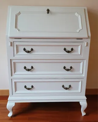 Vendo precioso escritorio tipo secreter (bureau) de estilo clásico con elegantes patas curvadas. Está pintado en blanco, ideal para decoraciones tipo Shabby Chic, Vintage o Provenzal. Es un mueble muy funcional y con mucha capacidad de almacenaje: Estado: El mueble es robusto y se puede usar pero tiene marcas, conviene restauracion. Falta un ojo de cerradura en un cajon, como se muestra en foto. Una de las dos partes que sujeta la mesa hay q reparar. Medidas: alto 102cm/profundidad cajon 35cm/ profundidad maxima 38cm/ancho 67cm Recogida en domicilio 3piso sin ascensor