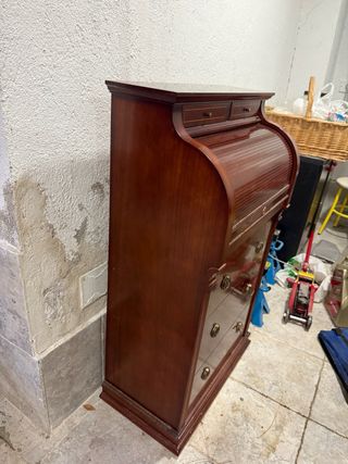 Elegante escritorio estilo secreter o buró con un práctico diseño de persiana enrollable. - Acabado en madera oscura. - Dos cajones superiores decorativos. - Tres cajones inferiores con tiradores metálicos. - Detalle de fileteado en los cajones. Con llave espejo y 3 cajones detrás de la persiana. Medidas Alto: 106 cm Ancho: 61,5 cm Fondo: 35 cm Negociable