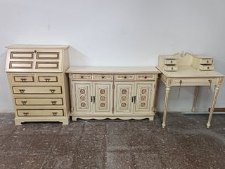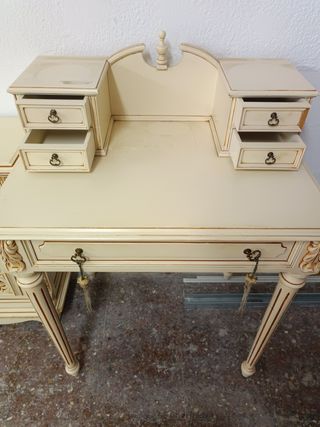 Vendo precioso escritorio tipo secreter (bureau) de estilo clásico con elegantes patas curvadas. Está pintado en blanco, ideal para decoraciones tipo Shabby Chic, Vintage o Provenzal. Es un mueble muy funcional y con mucha capacidad de almacenaje: Estado: El mueble es robusto y se puede usar pero tiene marcas, conviene restauracion. Falta un ojo de cerradura en un cajon, como se muestra en foto. Una de las dos partes que sujeta la mesa hay q reparar. Medidas: alto 102cm/profundidad cajon 35cm/ profundidad maxima 38cm/ancho 67cm Recogida en domicilio 3piso sin ascensor