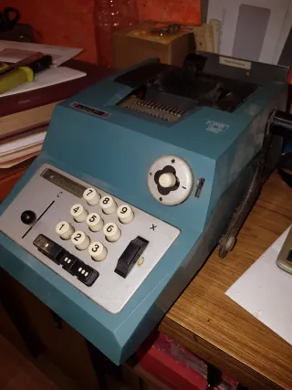 Calculadora mecánica de estilo retro en color azul. Un objeto de colección con un diseño clásico. - Teclado numérico. - Palanca lateral. - Rueda de selección.