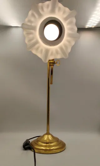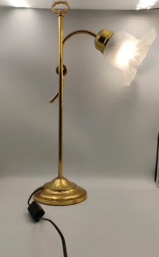 Elegante lámpara de sobremesa de estilo clásico. ➡️ Estructura de latón dorado con brazo articulado para ajustar la altura y dirección de la luz. ➡️ Tulipa de cristal opalino blanco con borde ondulado tipo "tulipán". Estado: Muy bueno, funcionando perfectamente. ➡️ Ideal para escritorio, mesita de noche o rincón de lectura. ➡️ Altura regulable mediante palomilla lateral. 📏 Medidas alto 55cm , diámetro base 15,50cm. 📍 Disponibles para ver sin compromiso. 🚚 Envío disponible. 📩 Consulta por mensaje privado
