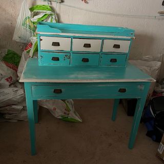 Precioso escritorio vintage de madera, pintado en turquesa y blanco. Tiene un toque desgastado que le da mucho encanto. Incluye una silla a juego. - Diseño antiguo con detalles únicos. - Perfecto para un espacio con estilo vintage o shabby chic. - Consta de un escritorio y una silla.