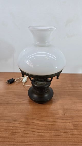 Preciosa lámpara de mesa vintage. Ideal para añadir un toque retro a tu hogar. - Pantalla de cristal opalino con detalles florales grabados. - Base de metal dorado con un elegante pie de color crema. - Perfecta para una mesita de noche o escritorio.