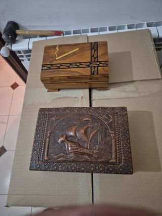 Preciosas cajas de madera, ideales para coleccionistas con música. Una caja tiene un diseño con incrustaciones y la imagen de un puro; la otra caja muestra un bajorrelieve de un barco antiguo. Ambas cajas son de madera oscura y lucen en muy buen estado. Para guardar pueos las 2 con musica. - Dos cajas de madera 40€. - Cada una por 25€. - Diseño vintage. - Una con incrustaciones y un puro. - Otra con bajorrelieve de un barco.