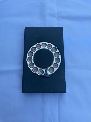 Teléfono de disco antiguo, ideal para coleccionistas. Se encuentra en buen estado de conservación, con señales normales de uso. - Teléfono de disco rotatorio. - Diseño compacto y portátil. - Color verde oscuro.