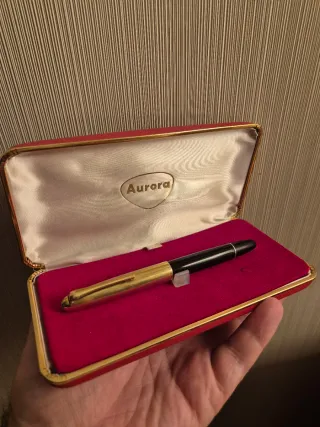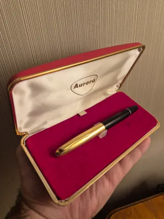 Elegante pluma estilográfica Aurora 88 de estilo vintage, presentada en su estuche original de época. Plumín de oro con trazo F suave y fluido. Una pieza de calidad y valor, dentro de las Auroras 88. En perfectísimo estado de conservación y desempeño. Escribe admirablemente bien. Pieza valor coleccionista