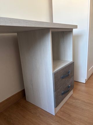 Escritorio juvenil con un diseño moderno y funcional. - Acabado en madera con detalles en gris. - Amplia superficie de trabajo. - Compartimento abierto. - Dos cajones con tiradores negros. - Comprado hace unos 2 años pero en buen estado. Precio negociable - Se entregaria montado. Precio negociable