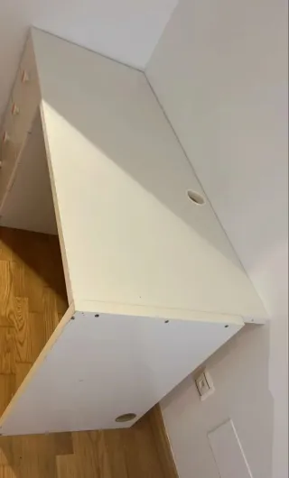 Escritorio de esquina de la serie Micke de Ikea. Su diseño moderno se adapta a cualquier espacio. Ideal como mesa de estudio o como puesto de oficina - Acabado en blanco con cajones en color haya claro - Fabricado en madera. Tiene un poco de óxido en la pata de metal y un rallazo en la tapa de la mesa que se ve en la segunda foto. Se vende desmontada (en la foto está ya medio desmontada) y con manual de montaje en papel. Sólo venta en mano. El comprador se encarga de recogida y transporte