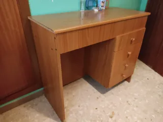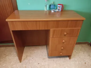 Escritorio de madera con un diseño clásico y funcional. Cuatro cajones integrados. Tiene una marca justo como se indica en la ultima foto. Venir a recoger