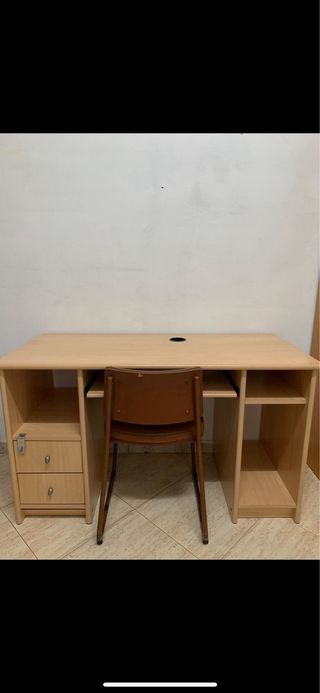 Mesa de escritorio funcional con un diseño clásico. - Acabado en madera clara. - Dos cajones con tiradores. - Estructura robusta.