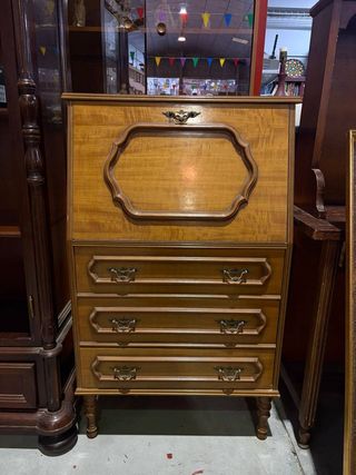 ✅ Ref. B11054 Mueble escritorio fabricado en madera de haya de muy buena calidad de color marrón oscuro. Se trata de un mueble escritorio que cuenta en la parte inferior con tres cajones amplios con tiradores metálicos en forma de asa y en la parte superior dispone de una puerta que al abrirse se transforma en una superficie sobre la que se puede escribir. Como se puede observar en las fotografías se encuentra en buenas condiciones. 📐 Medidas (ancho x fondo x alto): 70x40x114cm. Financia tus compras de forma inmediata. Visita nuestra web Cardiffstore o nuestra tienda en Baza (C/ Marte, 6 Pol. Ind. La Noria); Llámanos