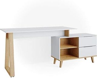 Escritorio con superficie blanca y estructura en tonos madera. Ideal para darle un nuevo aire. - Cajón con tirador verde. - Compartimentos abiertos para almacenamiento.