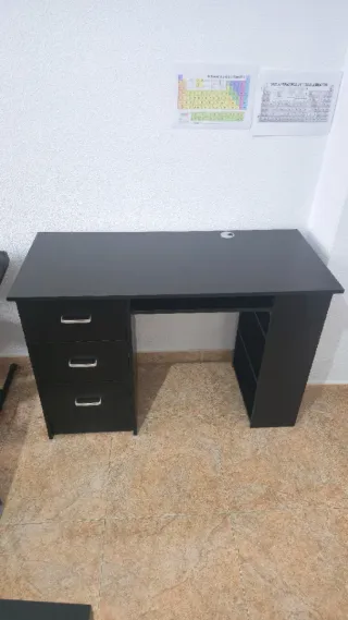Mesa de escritorio, ideal para tu ordenador. Cuenta con ruedas para facilitar su movilidad. Esta en buen estado y sus medidas son Alto zona escritorio 76cm, alto total 87cm, ancho 105,5cm, fondo con escritorio cerrado 52,5cm, fondo con escritorio abierto 80,5cm, fondo con escritorio abierto y cajón escritorio abierto 102cm. En la parte baja dcha cuenta con un cajón adicional. Zona habilitada para poner CPU de sobremesa. Tambien cuenta en la zana baja, parte central, con una bandeja extraible por si quieres colocar una impresora, scanner, etc. - Diseño funcional con baldas. - Acabado en tono madera oscura.