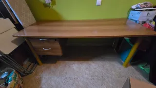 Mesa grande de madera de buena calidad, muy robusta y pesada, ideal como escritorio, mesa de trabajo, taller o estudio. 🪵 Características: Tablero gordo de madera. Patas de hierro gruesas, muy estables 2 cajones, uno de ellos con cerradura y llave Estilo industrial / clásico, muy resistente 📏 Medidas aproximadas: Largo: ≈ 180–190 cm Fondo: ≈ 70–75 cm Alto: ≈ 75 cm 📌 Estado: La mesa está en buen estado general. Como se aprecia ligeramente en la foto, el tablero tiene una leve curvatura en la parte central, pero sentado apenas se nota y no afecta a la estabilidad. 📍 Recogida en mano (es pesada) Precio: 60€