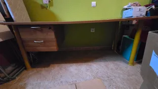 Mesa escritorio de madera en color marrón. Está en buen estado y apenas se ha usado. Se entrega desmontada. - Medidas amplias y cómodas. - Diseño curvado elegante. - Incluye dos cajones