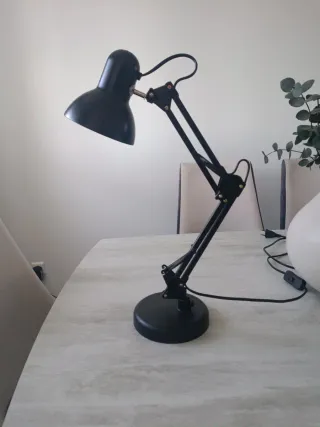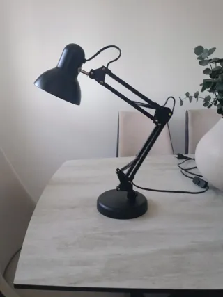Lámpara de escritorio con brazo articulado y base redonda. - Diseño moderno y funcional. - Brazo ajustable para dirigir la luz. - Materiales resistentes.