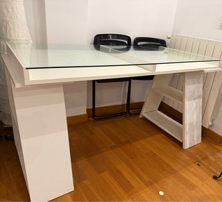 Escritorio de diseño moderno con superficie de cristal. Estructura metálica.