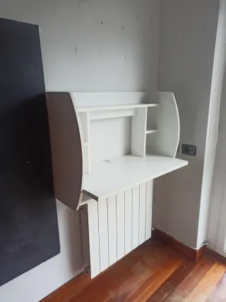 Escritorio compacto y funcional, perfecto para espacios reducidos sin patas queda en el aire - Acabado en blanco y detalles en madera. - Estructura de madera.