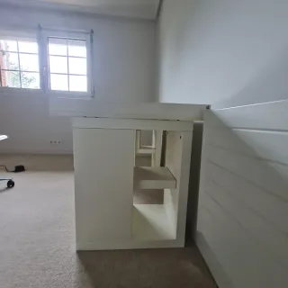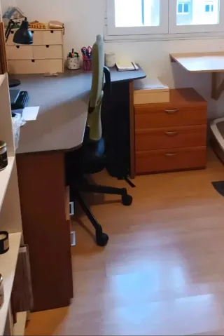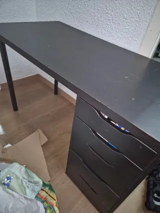Vendo escritorio IKEA moderno en color negro y blanco, muy elegante, en buen estado y muy funcional. Cuenta con amplia superficie de trabajo, cajonera con varios cajones, armario lateral y estantería superior, ideal para estudio, oficina en casa o despacho profesional. Es robusto, estable y cómodo para ordenador, papeles y material de trabajo. Dispone de pasacables para mantener el escritorio ordenado. Se vende por cambio de mobiliario.