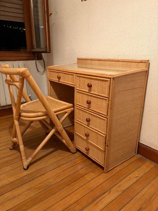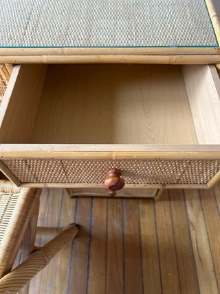 Conjunto de escritorio y silla de mimbre con un diseño natural y elegante. - Escritorio con tapa de cristal. - Silla a juego con estructura de mimbre. - Cajones con tiradores de madera.