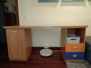 Escritorio de estudio en buen estado, con un diseño funcional. - Superficie de trabajo espaciosa. - Compartimentos de almacenamiento integrados.