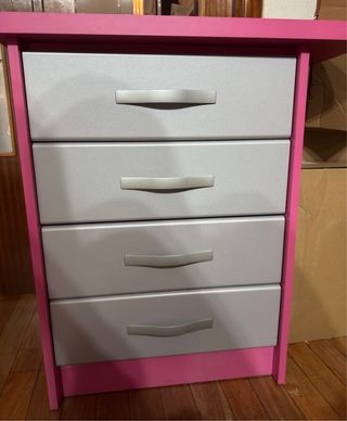 Mesa de escritorio con cajonera, ideal para organizar tu espacio. - Diseño moderno con estructura rosa y cajones grises. - Fabricada con materiales resistentes. Cuatro cajones, funcionan bien, la mesa estaba al la columna de un trozo mas encimera. Si se quiere se puede cortar.. atrás tiene un cachito levantado en la esquinera por dentro no ve. Se puede retocar. Por lo demás esta muy bien, la madera ea fuerte y mesa buena Se recoge en domicilio no puedo enviar porque el peso es bastante. Ancho encimera 66cm Ancho donde van los cajones 52 cm Fondo 53cm Alto 75cm Como se ve en las fotos es un buen cajonero