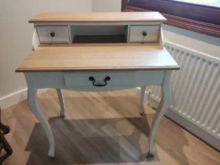 Elegante tocador o escritorio de madera, perfecto para cualquier habitación. - Madera - Diseño clásico con tres cajones. - Patas torneadas para un toque de estilo. - Tiradores metálicos.