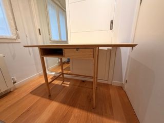Mesa de escritorio con un diseño elegante y funcional. Con varios cajones esa que se pliega y ruedas - Acabado en madera natural. - Amplia superficie de trabajo. - Cajones para almacenamiento.